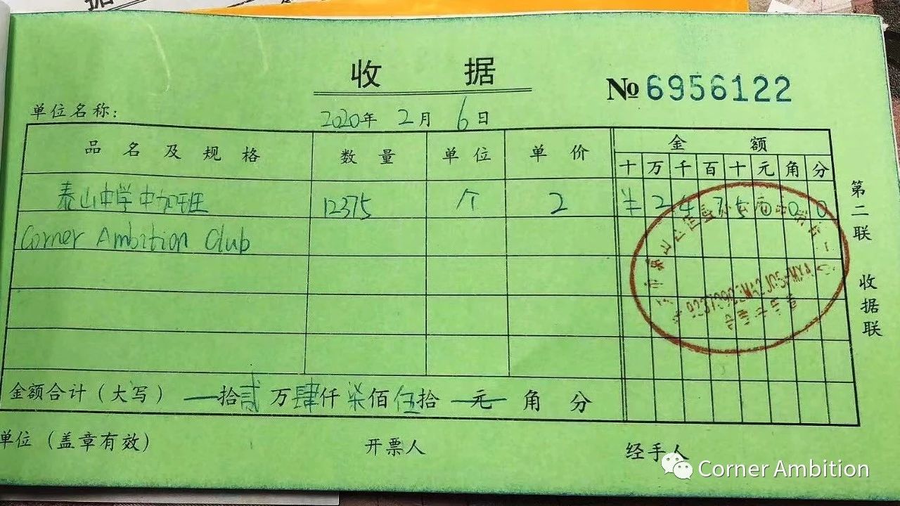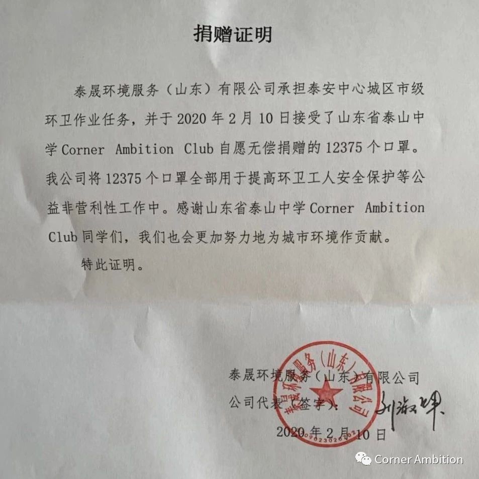 “一方有难、八方支援”,自此次新型冠状病毒爆发以来,广大一线环卫工人勇担社会责任,为疫情防控工作不懈努力。泰山中学中加班Corner Ambition社团发动同学、家长及社会爱心人士积极捐款,陆续收到匿名或实名捐款24750元,并全款购置防疫口罩,全部赠与环卫部门一线环卫工人,用自己的实际行动助力防疫,共同打赢疫情防控阻击战。