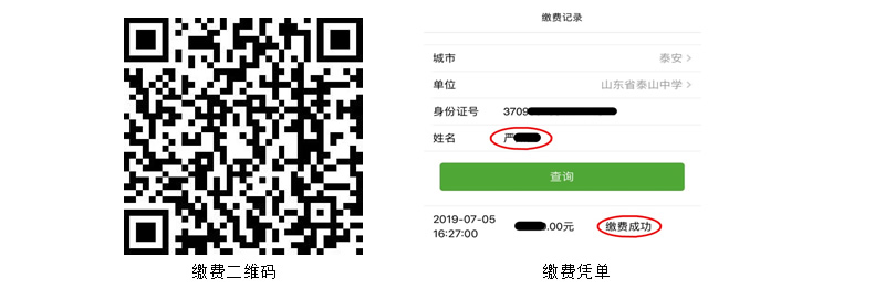 2.缴费方式:新生登录山东省泰山中学官网(中加班缴费另行通知),点击网页右上角“网上缴费”或者使用微信、支付宝扫描下方二维码直接进入缴费页面,凭学生姓名、身份证号登录缴费系统缴费(系统仅支持开通网上银行或手机银行的建行储蓄卡)。成功后返回缴费页面,点击底部“交易记录”查询出缴费记录并截图,如图所示: