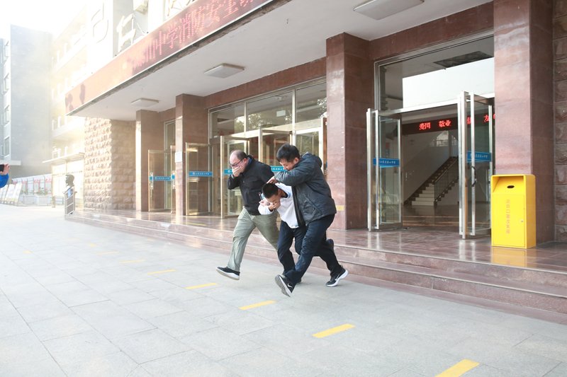 演练过程中模拟了个别学生未及时撤离的环节。当得知有学生躲在教室尚未撤离,两位应急经验丰富的安全员迅速赶赴教室,搜索寻找被困学生,带领学生成功撤至安全地带。
