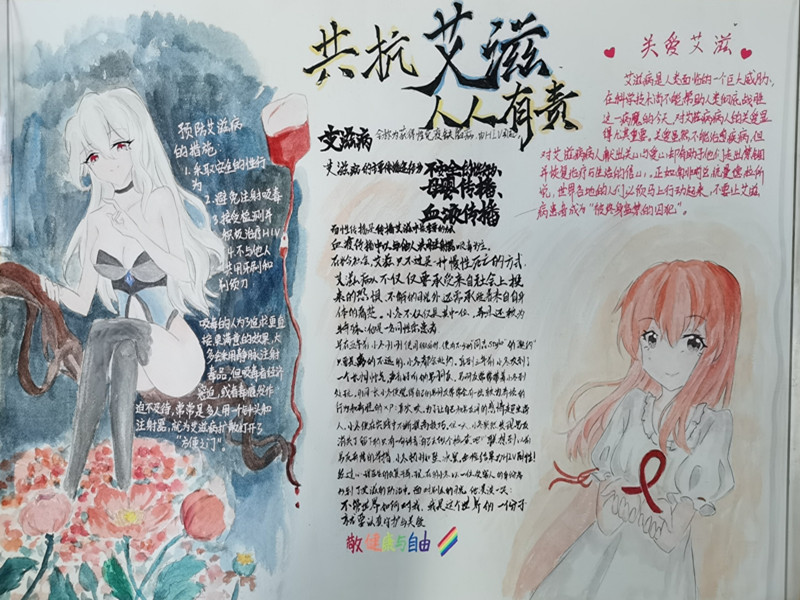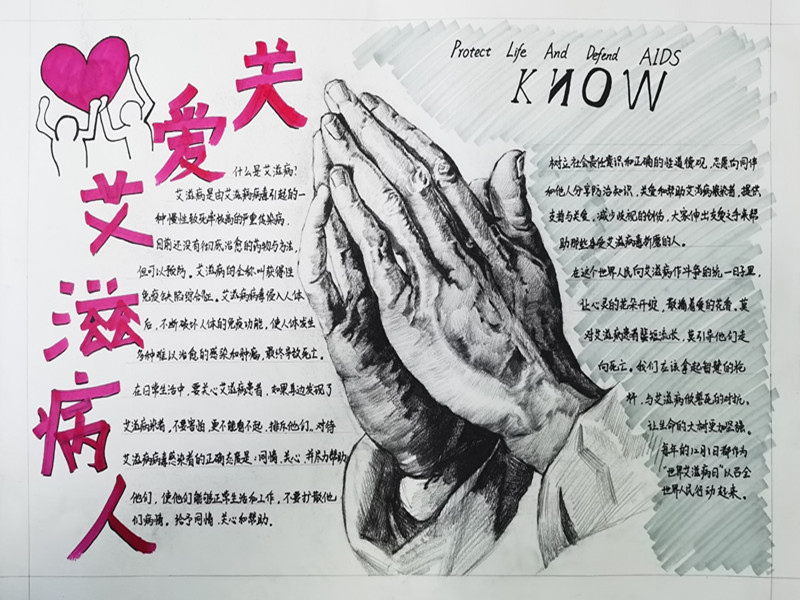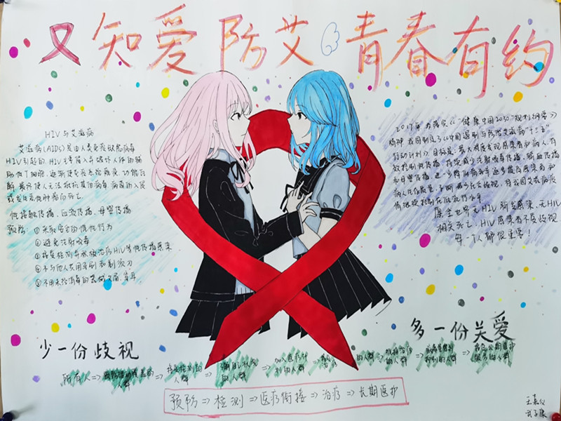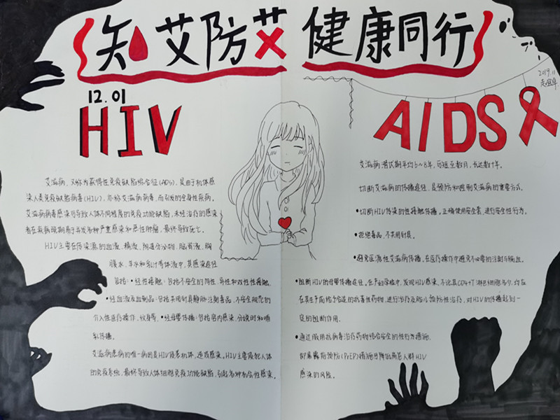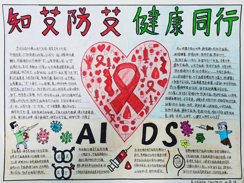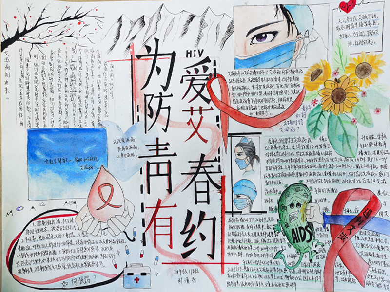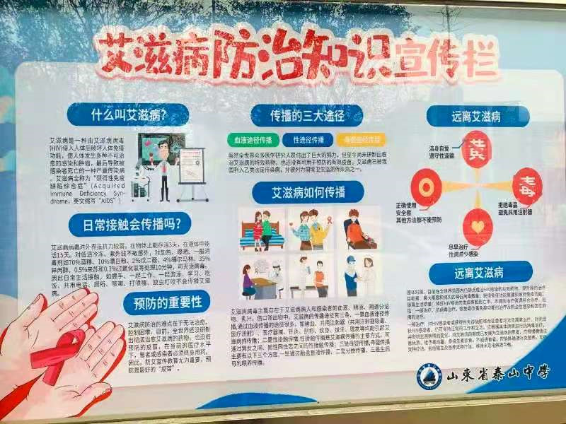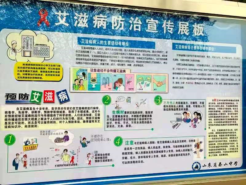 2020年12月1日是第33个“世界艾滋病日”,按照上级要求,泰山中学体卫艺处组织开展了以“携手防疫抗艾,共担健康责任”为主题的宣传活动,并开展了山东省泰山中学“知艾防艾健康同行”主题创新设计大赛,通过宣传展板和宣传栏、绘画和手抄报等形式开展宣传活动,旨在增强在校师生预防艾滋病的意识,从而构建一个更和谐的社会。