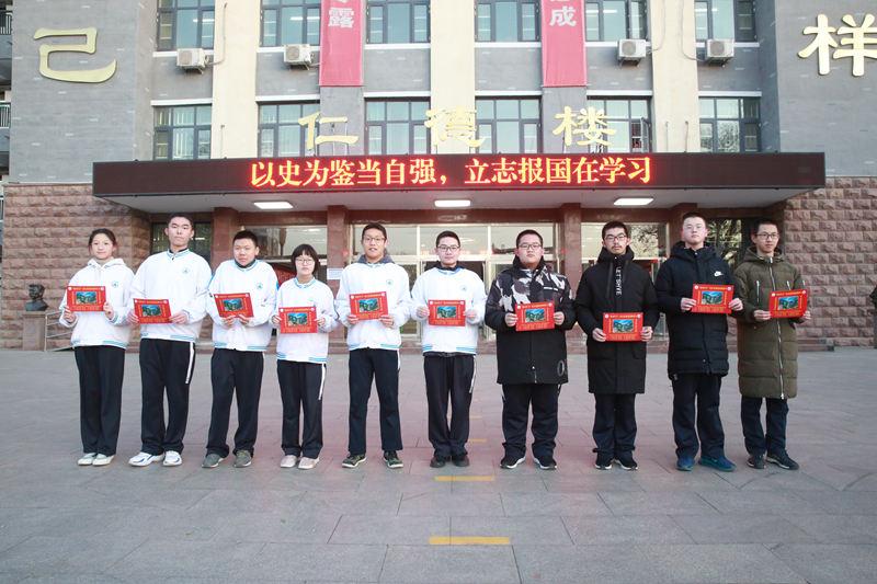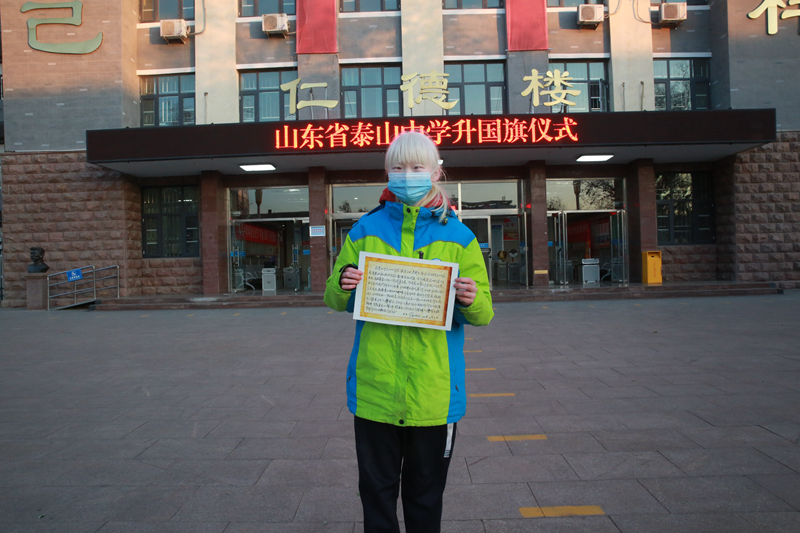 校长、党委书记徐炳伦在讲话中,对在第十八届全国中小学信息技术创新与实践大赛(即NOC大赛)决赛中,取得优异成绩的10名同学和热心公益、克服种种困难努力学习的高二2班学生田怡佳予以表彰,为他们颁发了“泰山中学泰山学子成长进步攀登卡”,并宣读了亲笔题写的颁奖词。