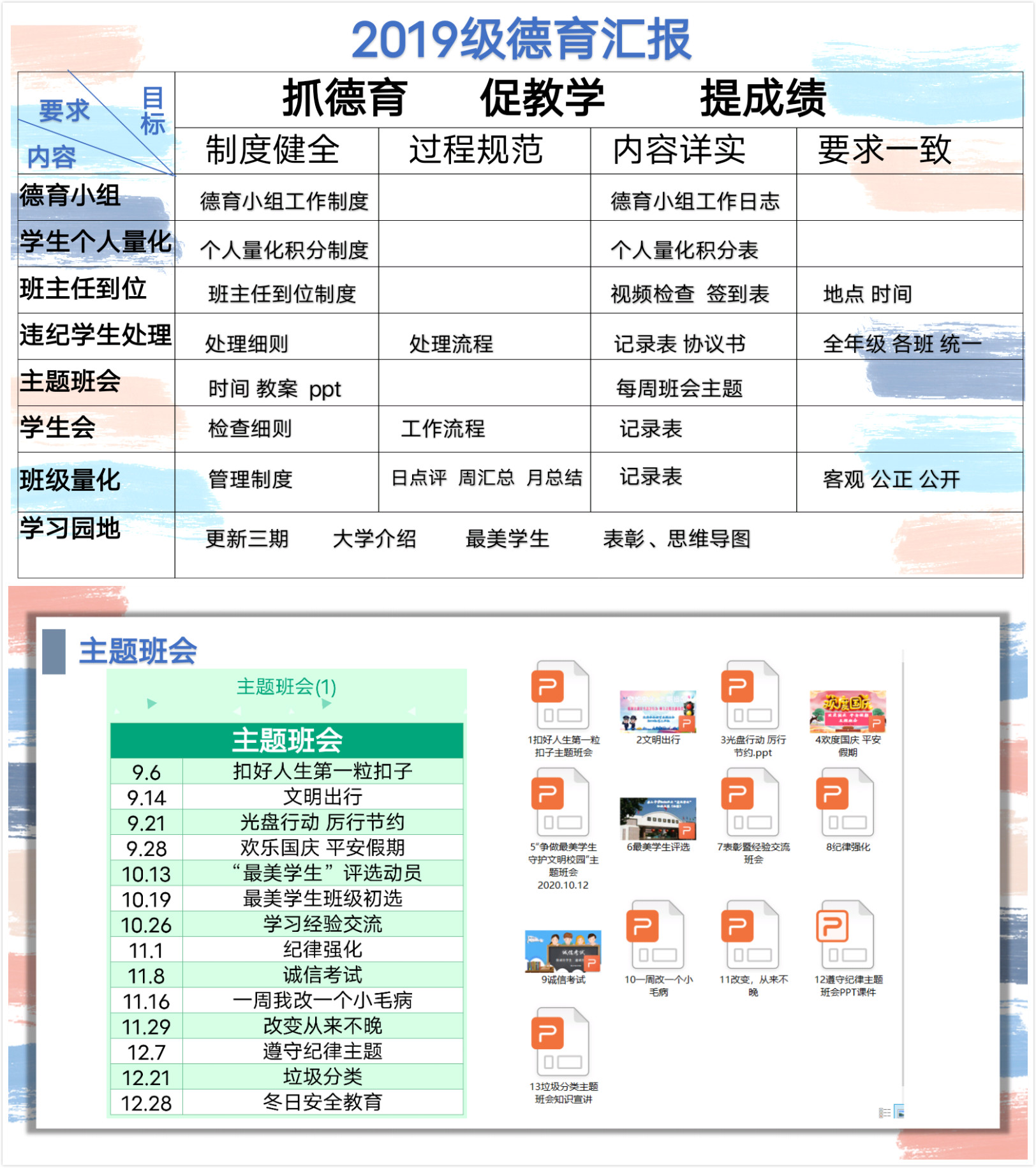 高二年级以“抓德育 促教学 提成绩”为目标,规范地建立了年级德育小组,对学生个人及班级量化和班主任到位等工作进行实时监控。每周按时召开主题班会,主题明确,内容详实,对学生起到了良好的教育作用。学习园地和黑板报内容定时更新,对同学们形成了很好的陶冶情操和榜样示范的作用。