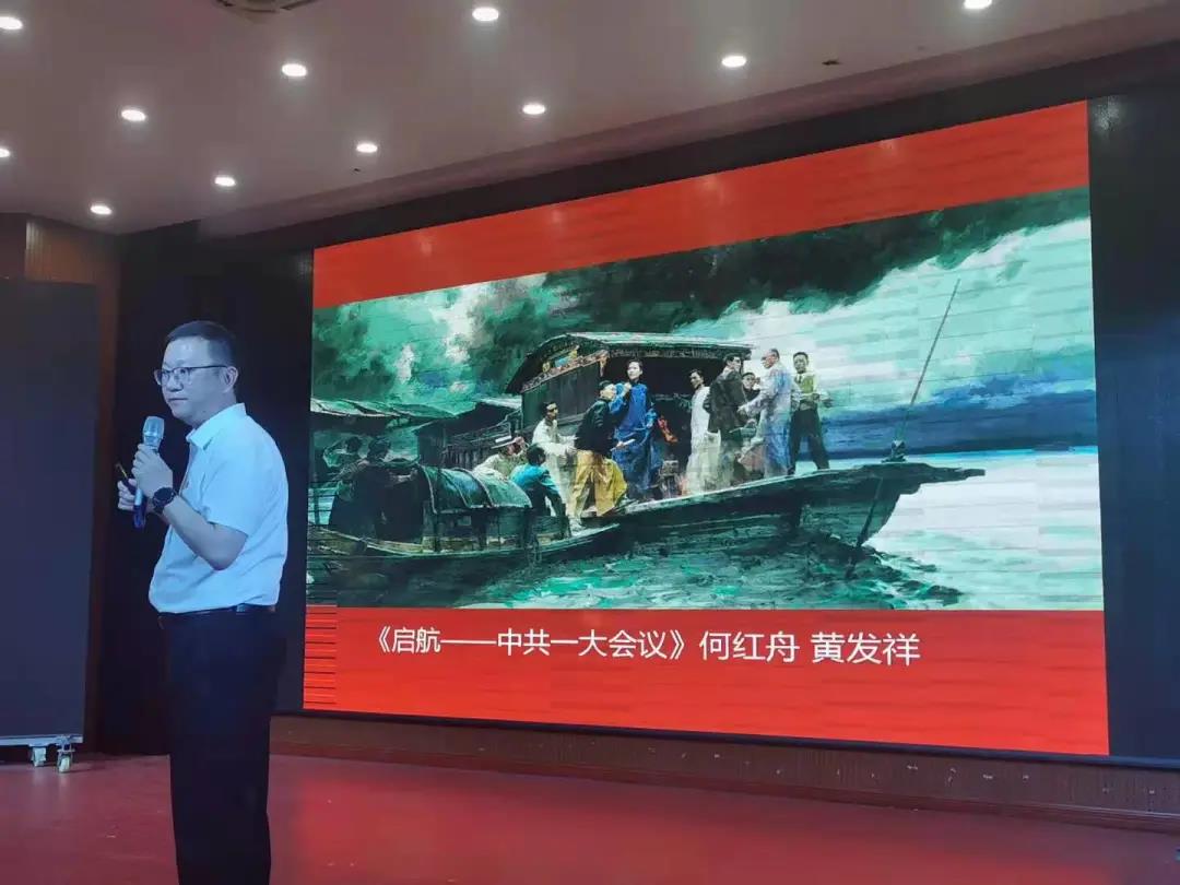宣讲人刘鑫同志作为一名美术学科党员教师,在党史故事宣讲活动中,创新讲课思路,将党史内容和经典美术作品结合起来,精心挑选了一幅幅具有代表性的美术作品,以画为体,以史为线,引导学生对红色美术作品从构图、表现手法、色彩、空间等方面进行鉴赏,带领大家穿越历史时空,跟随革命先辈足迹,重走革命道路,回望中国共产党诞生100年来波澜壮阔的成长、发展、壮大的历史,重温中国共产党在各个关键历史时期开展的重要历史活动,展现了中国共产党在历史关键时刻,敢于迎难而上,勇挑时代重担,领导中国人民创造的建军大业、建国大业、经济建设、改革开放等伟大历史奇迹,带领中国人民实现了从站起来到富起来、强起来的伟大历史飞跃,做出的伟大历史贡献,形象生动地阐释了“没有共产党就没有新中国”“只有社会主义才能发展中国”等真理的科学性、正确性。