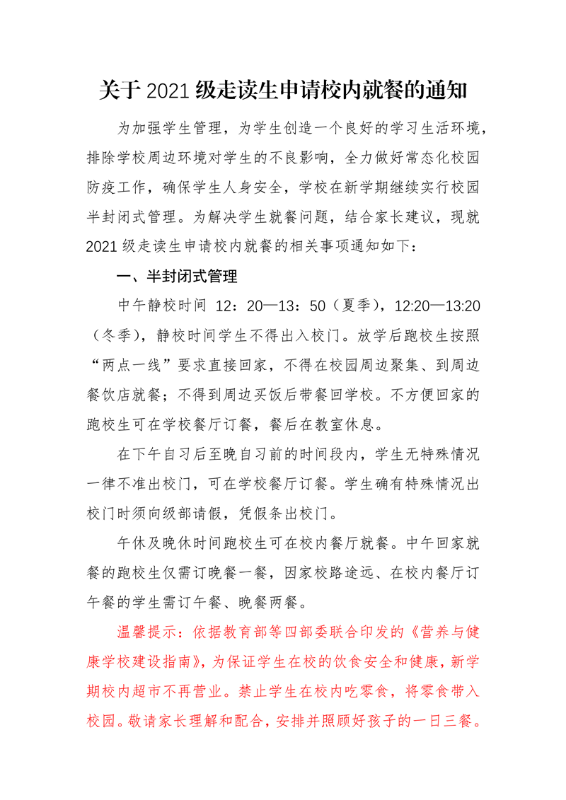 关于2021级走读生申请校内就餐的通知