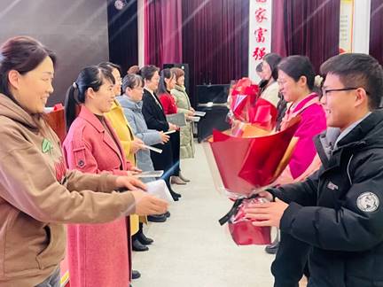 徒弟向师父献上鲜花,并行拜师礼,师父送给徒弟一本教育书籍。“一日为师,终身为师”,师徒结对,结下的是情谊,促进的是成长。