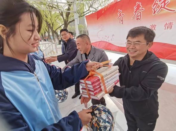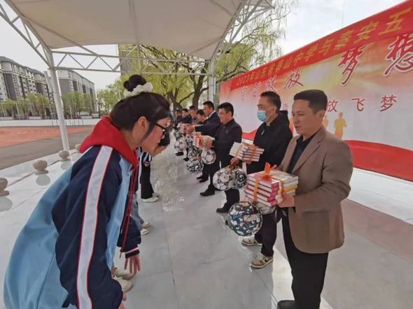 两校师生首先同唱国歌,歌唱伟大的祖国。接下来泰山中学向泰安五中捐赠了足球、篮球和书本,两校学生开展了精彩的篮球友谊赛。