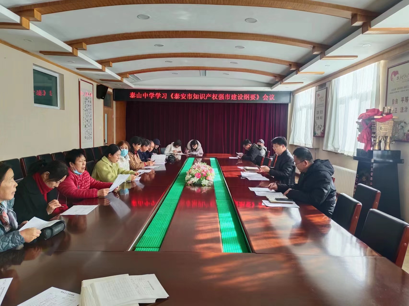 11月13日,泰山中学召开专题会议,组织学习《泰安市知识产权强市建设纲要》文件精神。