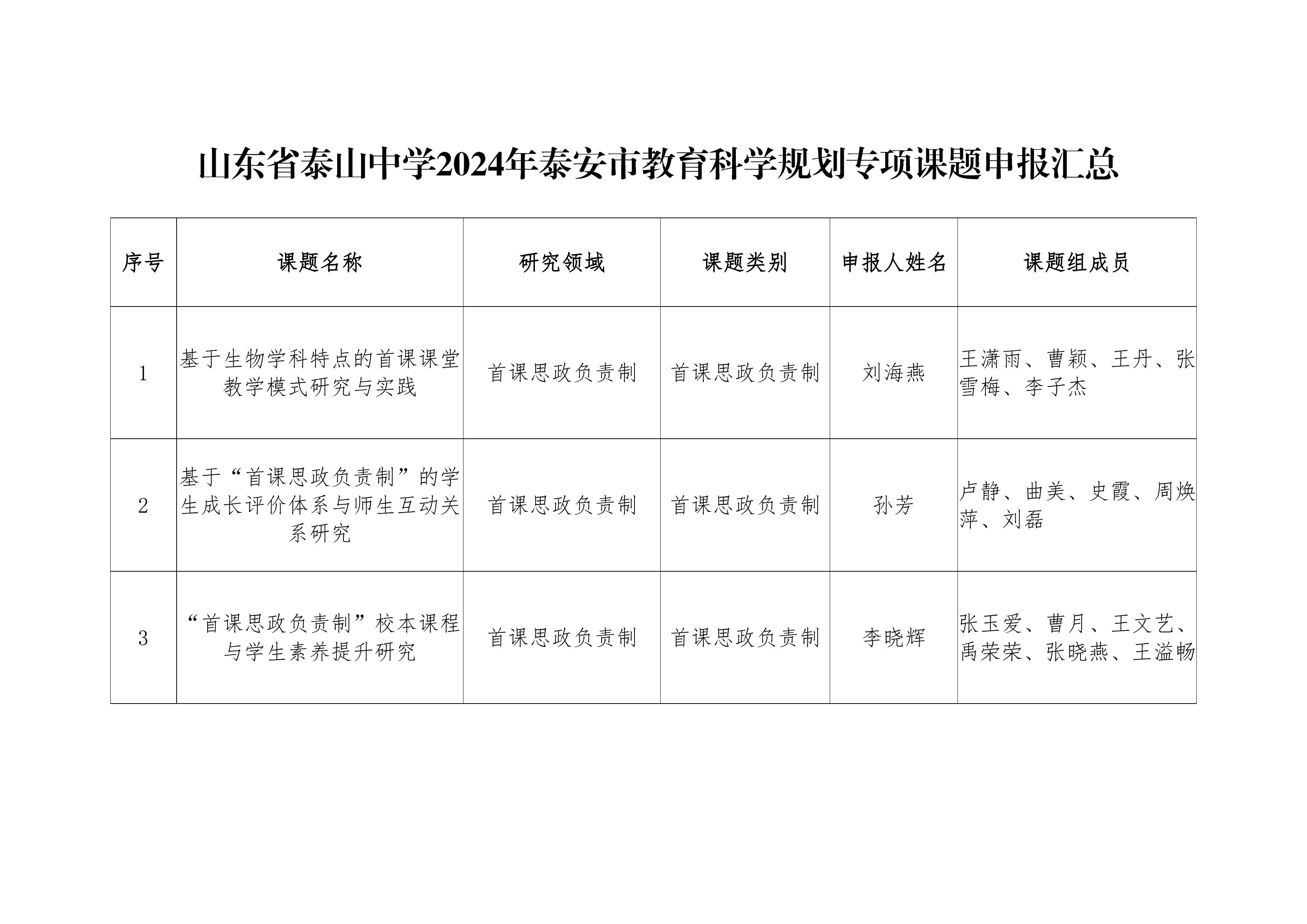 山东省泰山中学2024年泰安市教育科学规划首课思政负责制专项课题申报汇总