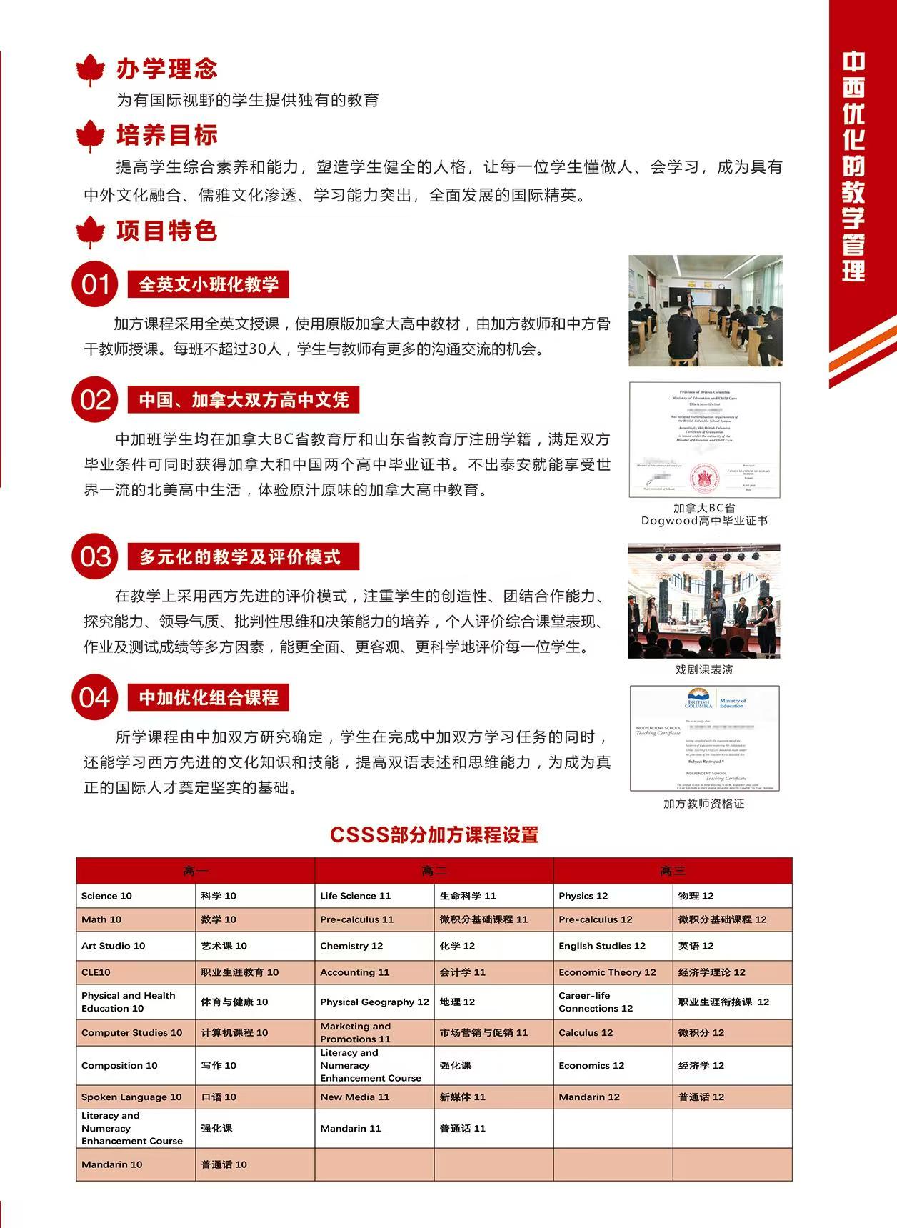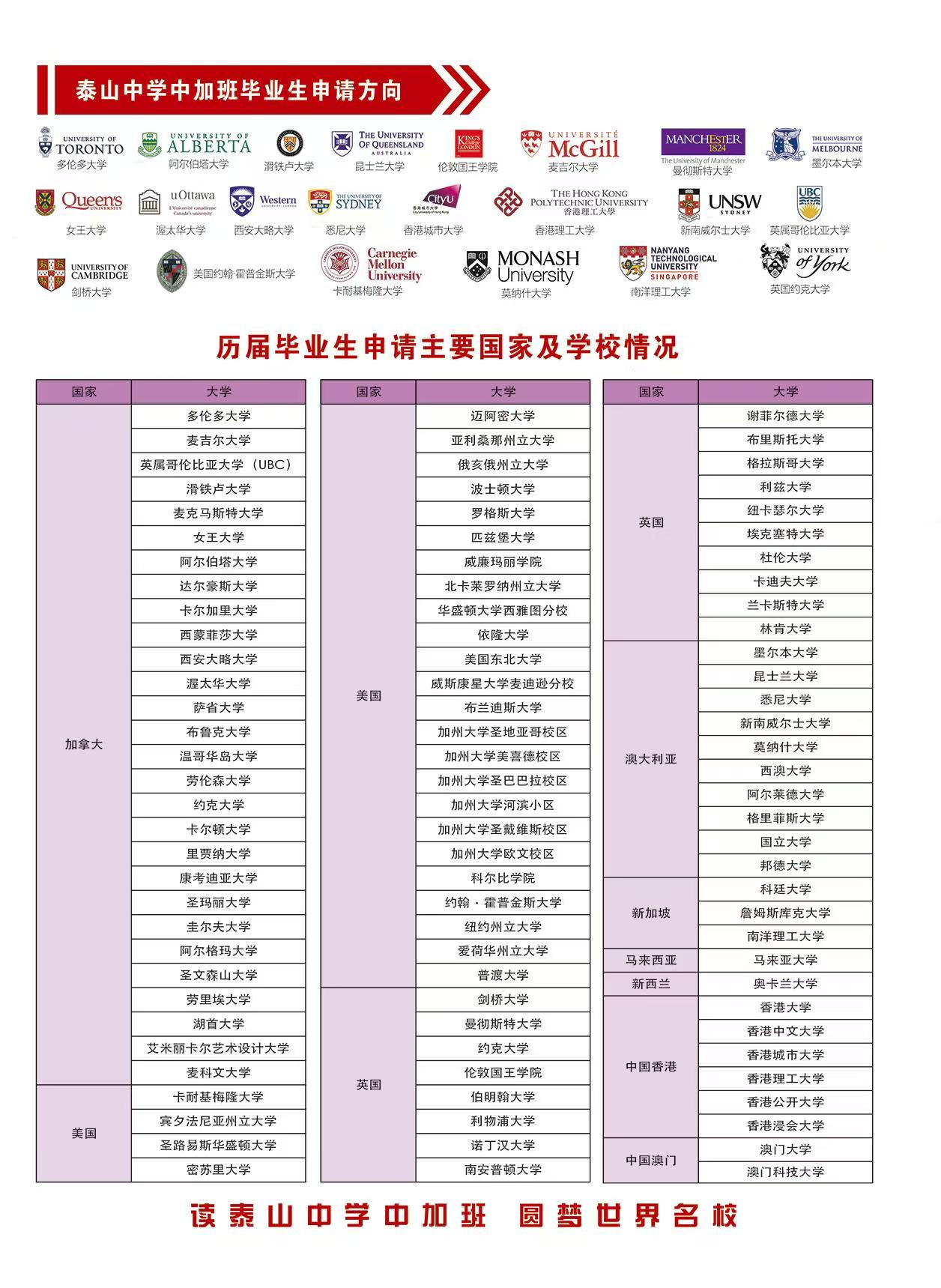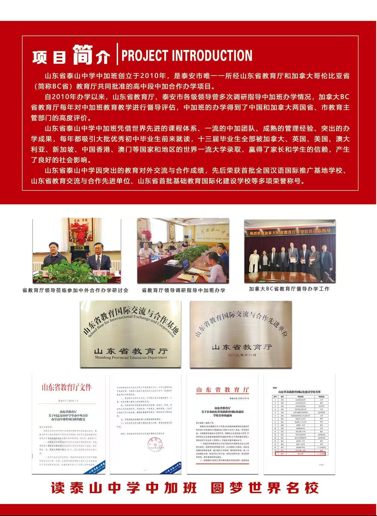 山东省泰山中学中加班创立于2010年,是泰安市唯一一所经山东省教育厅和加拿大哥伦比亚省(简称BC省)教育厅共同批准的高中段中加合作办学项目。