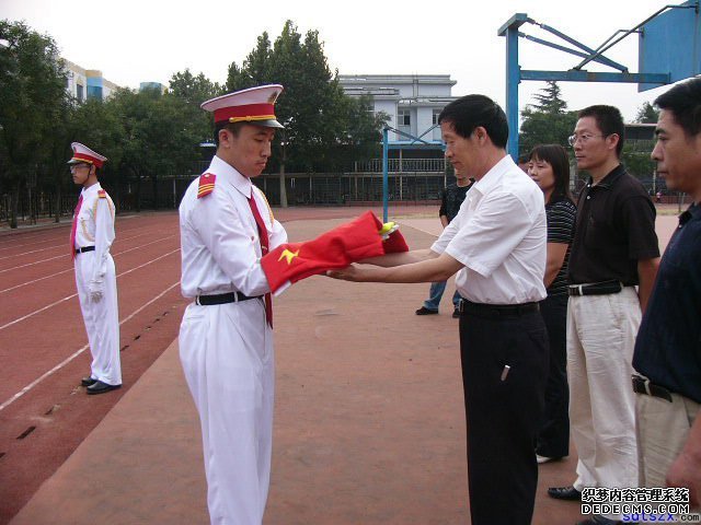 二○○七年九月十七日下午五时三十分,一场隆重简短的授旗仪式在庄严的五星红旗下举行。校党委副书记田揽云老师从首届国旗班班长手中接过一面鲜艳的国旗交到第二届班长手中。田书记在仪式上讲话,既肯定了首届国旗班所取得的成绩又对新一届国旗班寄予很高的期望,希望他们在继承老国旗班优良传统的基础上再创辉煌。